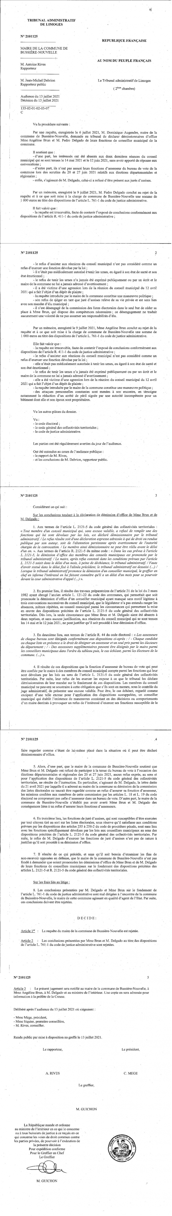 La commune de Bussière-Nouvelle a saisi le tribunal administratif de Limoges pour tenter de faire démissionner d’ office, les deux conseillers municipaux de l’ opposition.